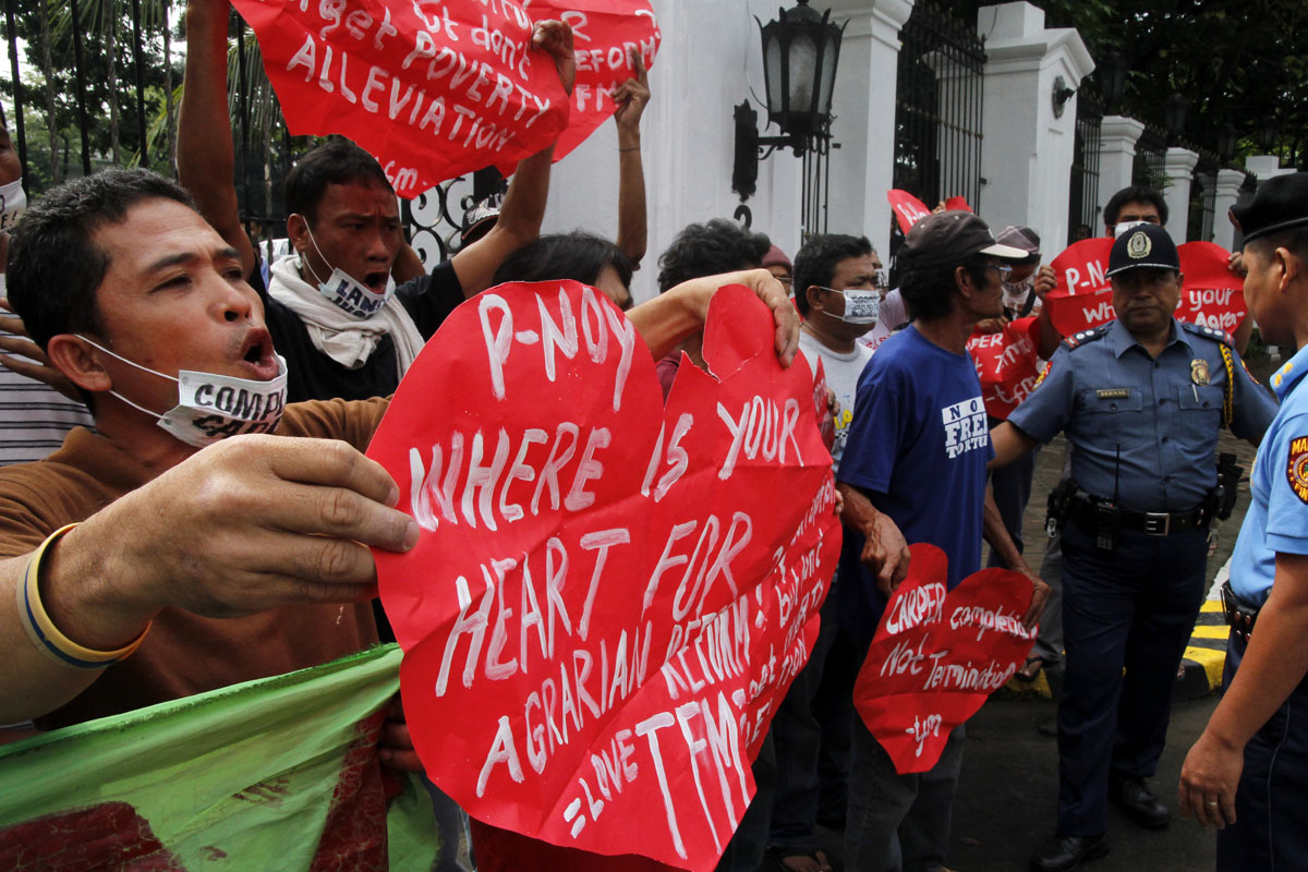 On February 14, 31 farmers representing various groups from Bukidnon, Negros and Davao passed thru checkpoints via passenger jeeps and staged a picket-rally to dramatize their call for President Aquino to complete and not terminate the Comprehensive Agrarian Reform Program Extension with Reforms (CARPER). They were apprehended and herded to a police vehicle and brought to the Manila Police District Headquarters in UN Avenue in Manila.