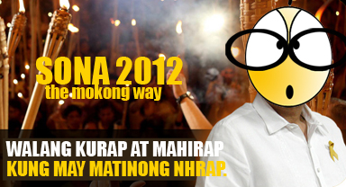 Mokong: Ito po ang aking ikatlong SONA at wala pa rin akong balak maglabas ng National Human Rights Action Plan (NHRAP), at parang kailan lang nang sabay-sabay tayong nagpasyang tahakin ang tuwid na daang para lamang sa iilan. Parang kailan lang nang sinimulan nating iwaksi ang wang-wang, hindi lamang sa kalsada kundi sa sistemang panlipunan.