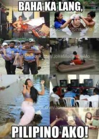 Filipinos are a happy people. We could make fun of even the worst things, just like this flood brought about by the inclement weather. No wonder, even if the water is up to the neck, we still pose and smile in front of a camera. This does not mean we don’t take things seriously, we are just not so affected emotionally because our positive outlook in life is that strong. If this situation is a problem, we would just laugh at it. There is popular belief in the Filipino that says “tawanan mo ang iyong problema“, so we don’t get terribly devastated emotianally and we rise with grace and smile over what life brings on.