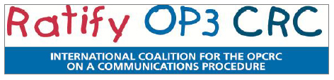 Ratify OP3 CRC – International Coalition for the OPCRC on a Communications Procedure, a group of over forty national, regional and international children’s rights NGOs and institutions, is guided by a Steering Committee composed of: African Child Policy Forum, Eurochild, Child Rights Coalition Asia (CRC Asia), Child Rights International Network (CRIN), Global Initiative to End All Corporal Punishment of children (GIEACP), NGO Group for the Convention on the Rights of the Child (NGO Group for the CRC), Kindernothilfe, Plan International, Red latinoamericana y caribeña por la defensa de los derechos de los niños, niñas y adolescentes (Redlamyc), Save the Children, Terre des Hommes International Federation (TDHIF), and World Vision.