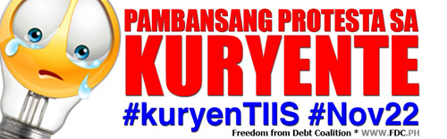 MANILA, Philippines – The Freedom from Debt Coalition, together with various people’s organizations, will be holding a National Day of Protest on November 22, 2012 to register the people’s resistance to the skyrocketing electricity rates that continue to burden the people and the relentless privatization of the power industry under the EPIRA or Electric Power Industry Reform Act.