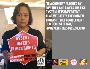 “In a country plagued by impunity and a weak justice system, it is imperative that we ratify the Convention as it will complement our domestic law,” said Mary Aileen Diez-Bacalso, CAED Convenor and Secretary-General of the Asian Federation Against Involuntary Disappearances (AFAD).