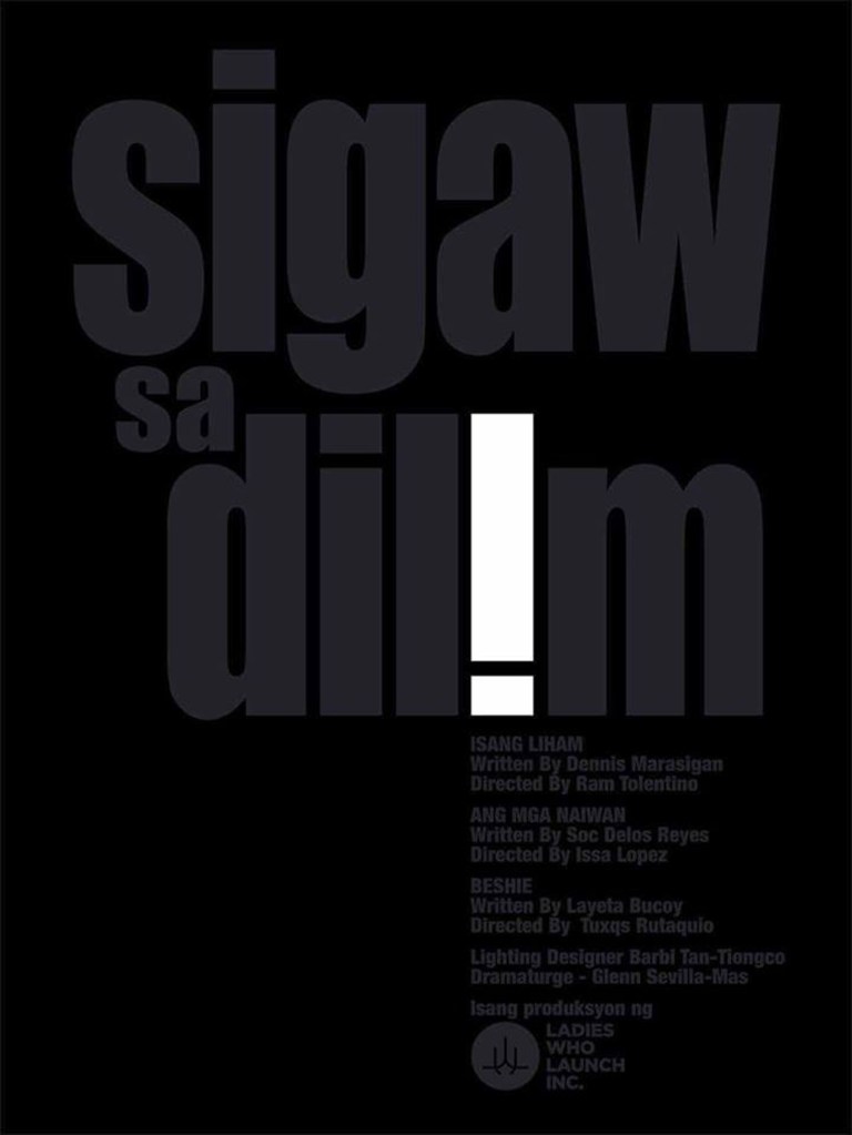 SIGAW SA DILIM is a set of three one-act plays featuring characters affected by the deadly war on drugs, better known as Operation Tokhang, in the poor communities around the country.
