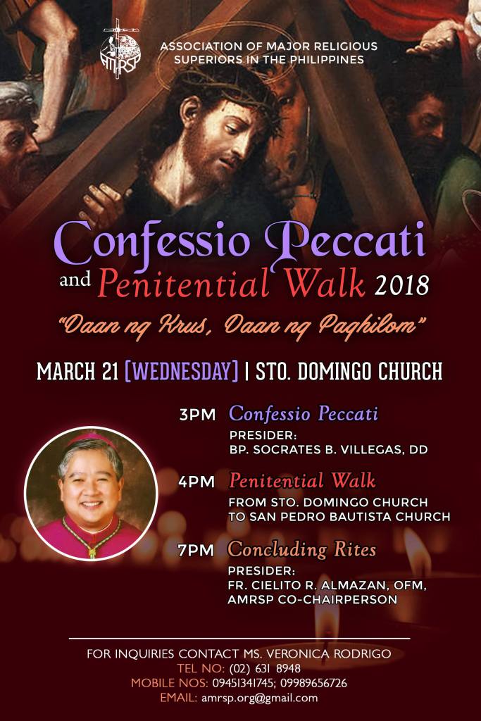 The Association of Major Religious Superiors in the Philippines (AMRSP), in celebration of the Year of the Clergy and Consecrated Persons, will hold a CONFESSIO PECCATI, which literally means “confession of sins”, and PENITENTIAL WALK dubbed as “Daan ng Krus, Daan ng Paghilom”, on March 21, Wednesday, 3pm, at Sto. Domingo Church, Quezon City.