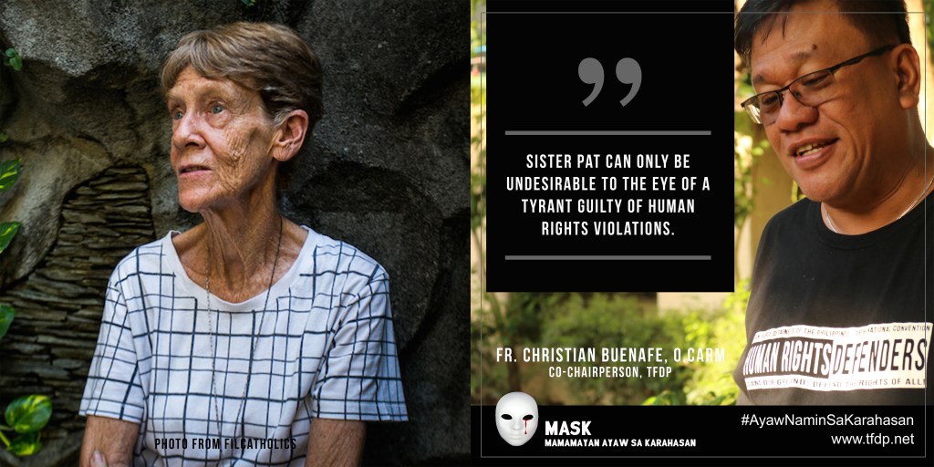Task Force Detainees of the Philippines (TFDP) calls the decision of the Philippine Bureau of Immigration (BI) to forfeit Sr. Pat Fox missionary visa as an obvious political persecution of a human rights defender, an attack on freedom of political beliefs and free speech, using immigration laws against ‘undesirable aliens’ as an excuse. Sister Pat can only be undesirable to the eye of a tyrant guilty of human rights violations.