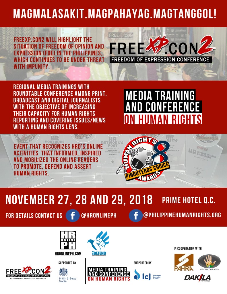 On day one, participants will be joined by bloggers and individuals representing various civil society organizations in the Freedom of Expression Conference 2 (FreeXP.con2). FreeXP.con2 will highlight the situation of freedom of opinion and expression (FoE) in the Philippines, which continues to be under threat with impunity.