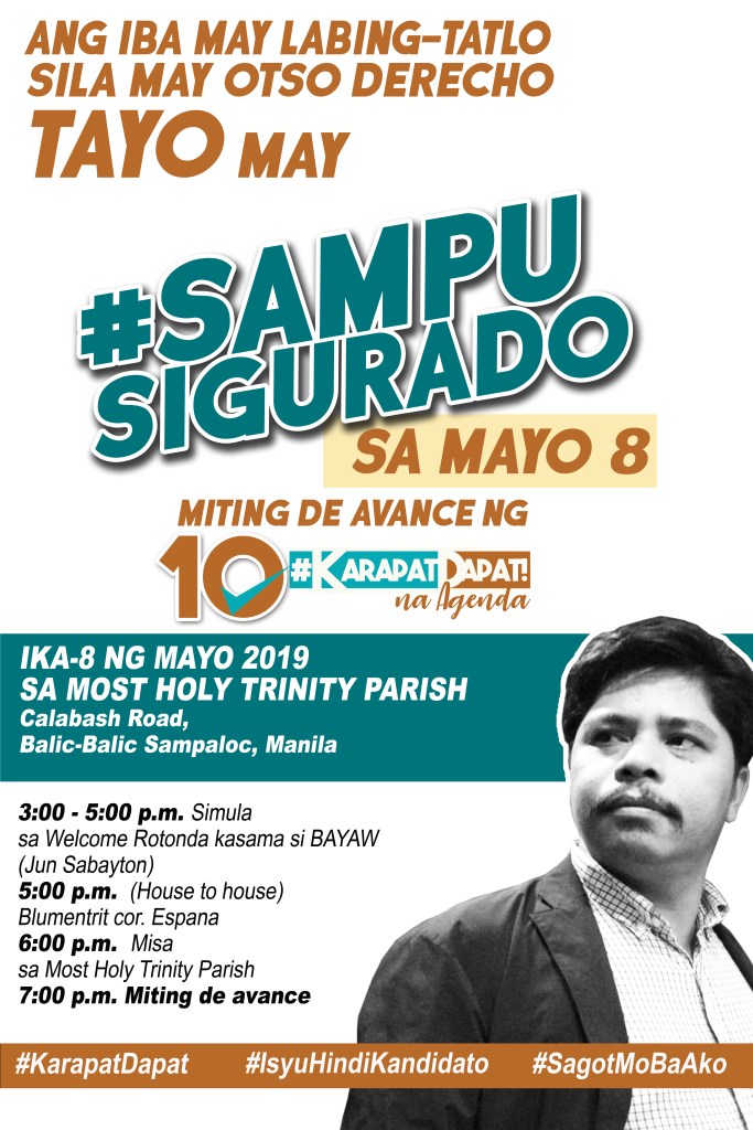 Malugod po namin kayong inaanyayahan sa ating pinakamalaking pagkilos sa ika-8 ng Mayo 2019. Ito po ang culmination o dulo ng ating kampanyang #KARAPATDAPAT , 10 POINT HUMAN RIGHTS ELECTORAL AGENDA and Beyond , na ang layunin ay magsilbing gabay ng publiko sa pagpili ng nararapat na kandidato. Ang kampanya ring ito ay nagsisilbing hamon sa mga kandidato na maging pangunahin ang karapatan at dignidad ng tao sa kanilang mga programa o plataporma de gobyerno. Ang okasyong ito ay magsisilbing Miting de Avance para sa Karapatang Pantao.