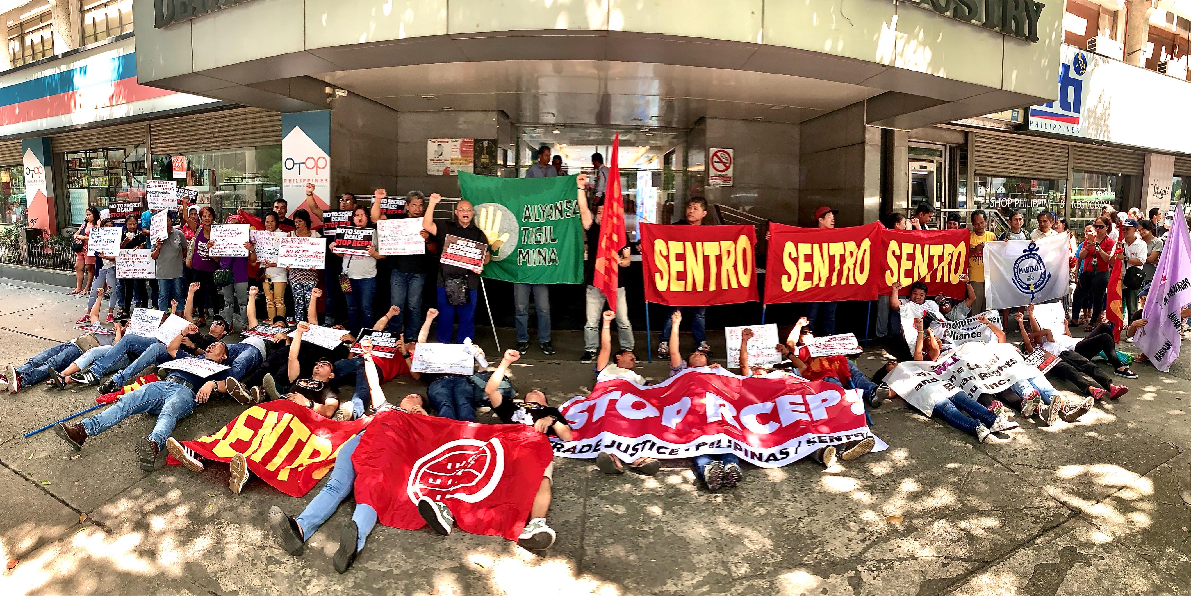 Trade activists staged a die-in at the DTI offices in Makati, Philippines to dramatize the peoples’ oppostiion to RCEP. 4 November 2019. Photo by Del Banares of Sentro