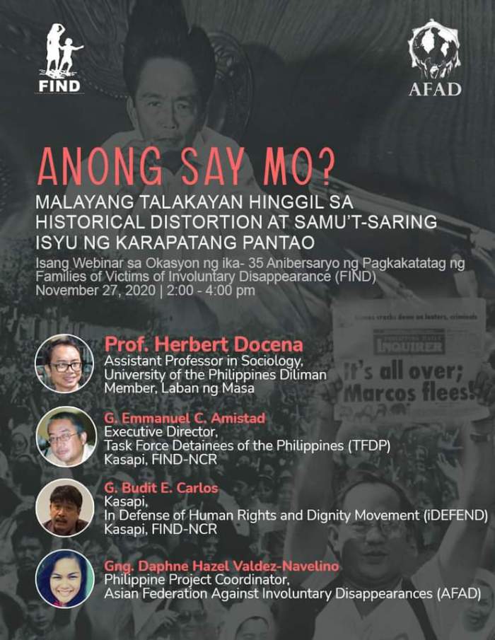 Kasama ang mga biktima ng sapilitang pagwala at kanilang mga pamilya, mga organisasyong nagtataguyod ng mga karapatang pantao, at mga indibidwal na tagapagtanggol ng karapatang pantao, samahan ninyo kaming pag-usapan at talakayin ang napapanahong isyu patungkol sa Historical Distortion at iba’t-ibang mga usapin ukol sa karapatang pantao.