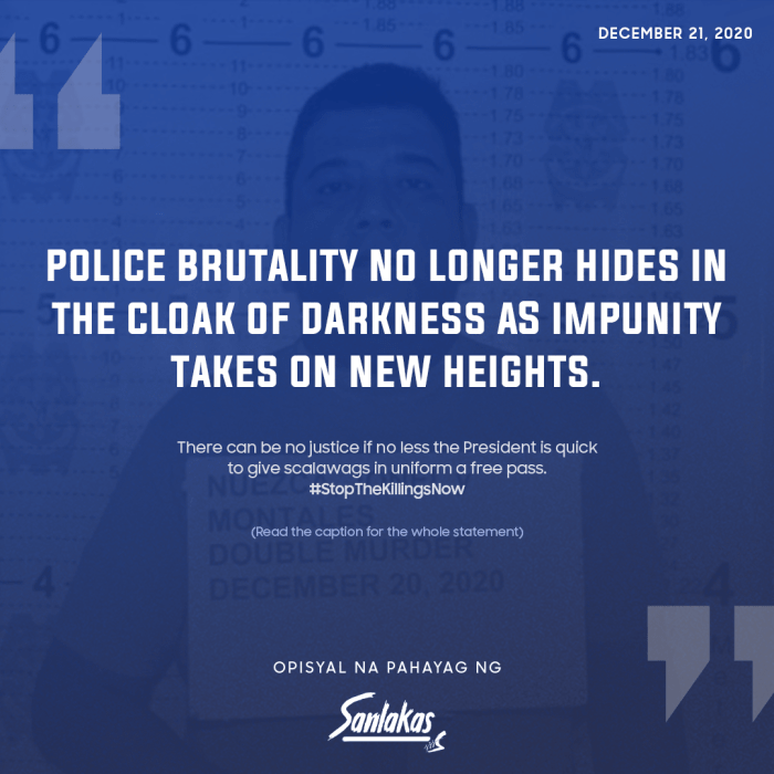 Sanlakas vehemently condemns the brutal and brazen execution of Sonya Gregorio and Frank Anthony Gregorio. This was not an isolated incident as their deaths add to the growing number of casualties whose deaths have been perpetrated by the police. The police has been emboldened by President Duterte’s marching shoot-to-kill orders against citizens on the pretext of fighting crime. This recent display of barbarism and callousness highlight the danger the public faces in the hands of the police.