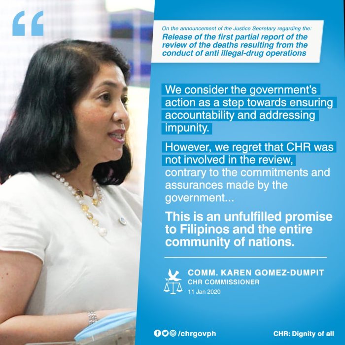 Statement of CHR Commissioner Karen Gomez-Dumpit on the announcement of the Justice Secretary regarding the release of the first partial report of the review of the deaths resulting from the conduct of anti illegal-drug operations