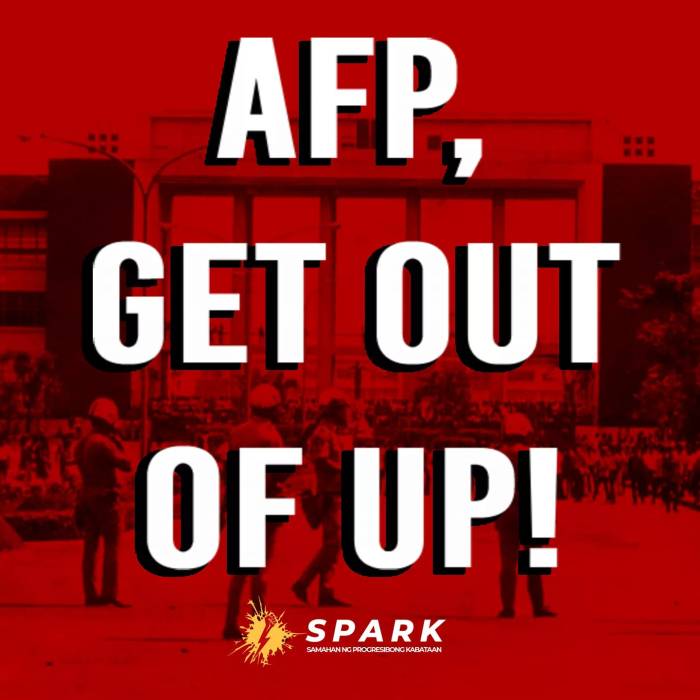 SPARK condemns the illegal and tyrannical unilateral decision of the Armed Forces of the Philippines to terminate the 1989 Sotto-Enrile Accords, which prevents the entry of military personnel into campuses of the University of the Philippines. The AFP claims that this was prompted by the presence of the CPP-NPA – which it has recently classified as terrorist organizations – inside University of the Philippines campuses, thus incurring the need for UP campuses to be garrisoned by military forces.