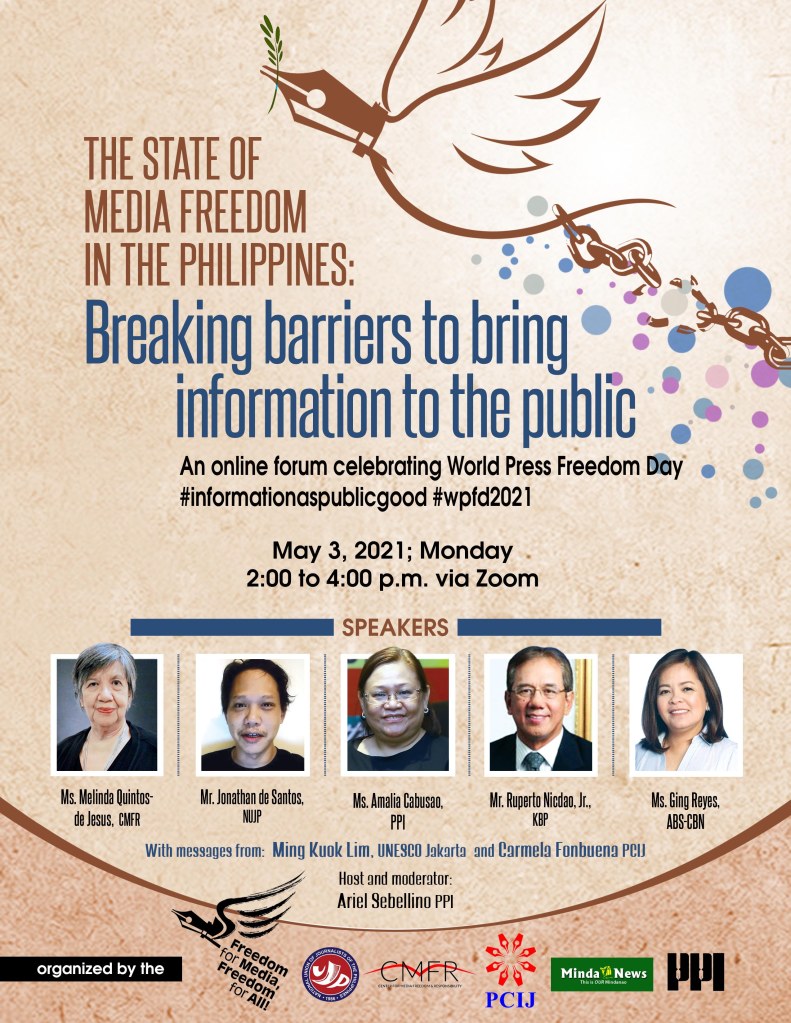May 3 is World Press Freedom Day. Please join us in an online discussion on the biggest challenges confronting our community. This is open to media practitioners, campus journalists, and members of the academe and civil society organizations. The program will also be livestreamed on social media.