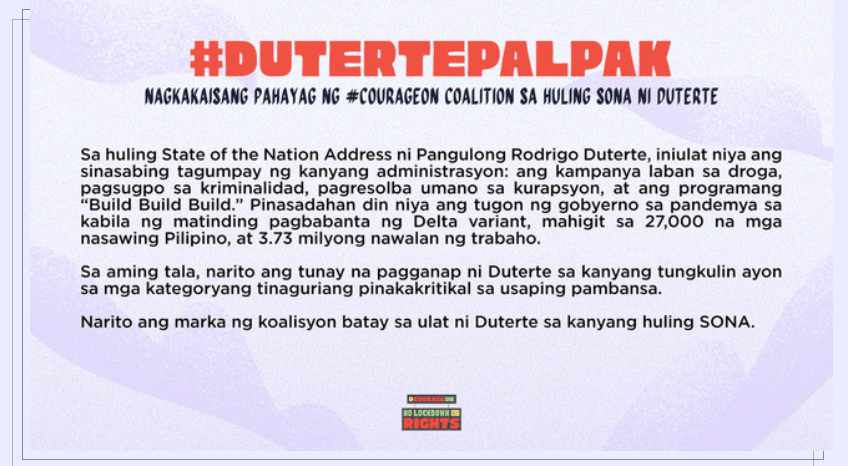 Below is the statement of the #CourageON: No Lockdown on Rights coalition, which was signed by more than 70 organizations, following President Rodrigo Duterte’s final State of the Nation Address on July 26. #CourageON is a broad coalition of human rights groups that aims to keep watch on abuses and violations and identify opportunities for collective action to promote and defend human rights.