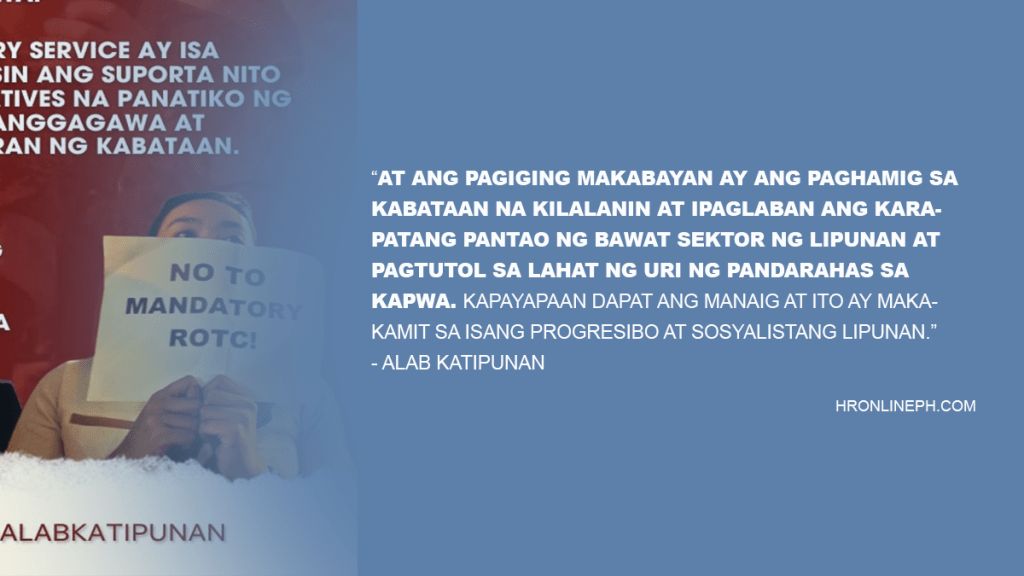 Ang mungkahi ni Duterte-Carpio na mandatory military service ay isa lamang paraan ng mga reaksyunaryo upang palakasin ang suporta nito mula sa mga right-wing, anti-communist, at conservatives na panatiko ng gobyernong Marcos-Duterte. Walang malasakit sa manggagawa at maralita ang mga elementong ito at hindi dapat tularan ng kabataan.