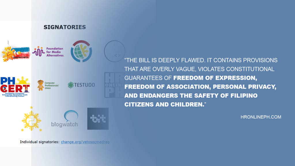 The intent and purpose of trying to eliminate illegal activities enabled by mobile phones, the Internet, or other electronic communication-aided crimes are noble. However, the bill is deeply flawed. It contains provisions that are overly vague, violate constitutional guarantees of freedom of expression, freedom of association, personal privacy, and endangers the safety of Filipino citizens and children.
