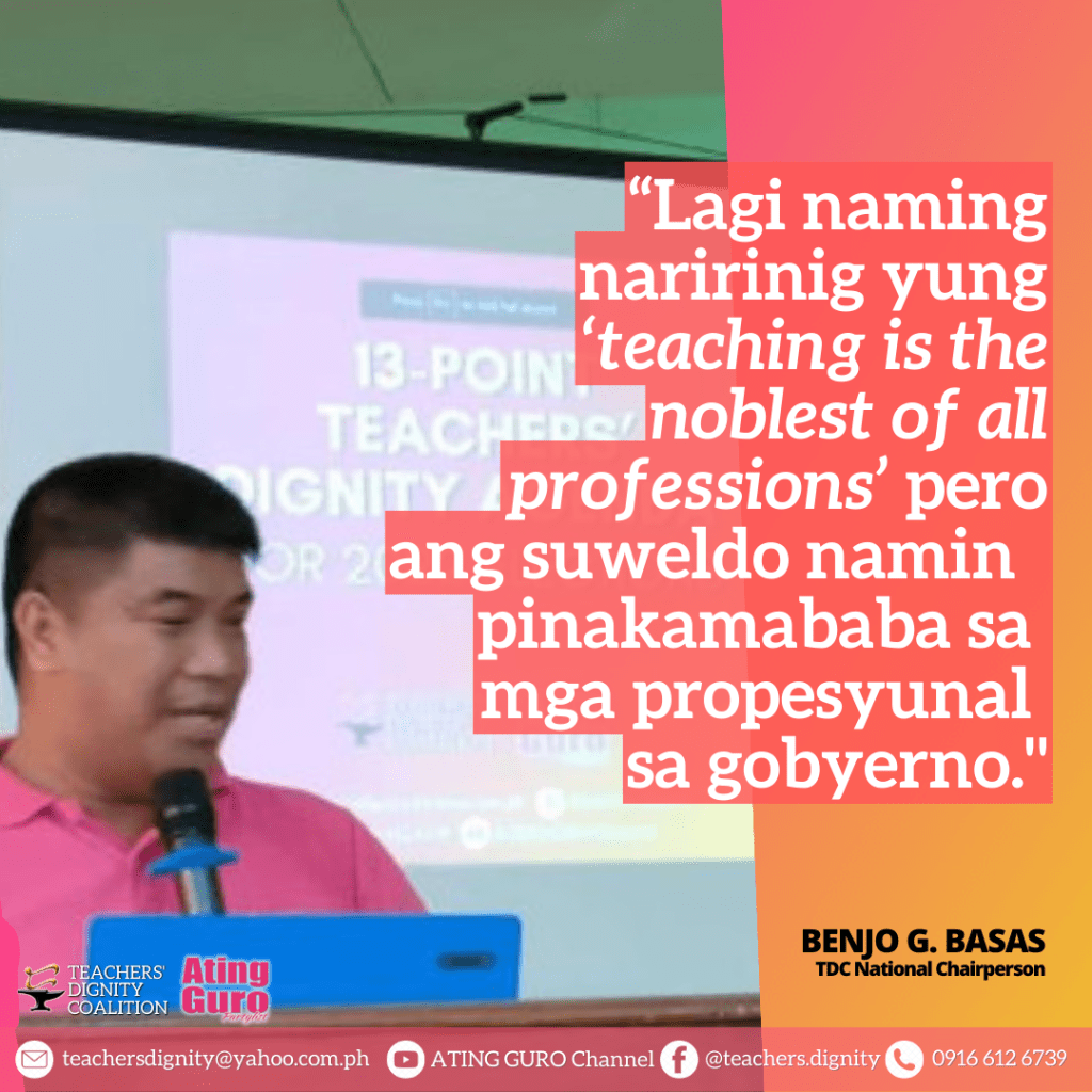 “Lagi naming naririnig yung ‘teaching is the noblest of all professions’ pero ang suweldo namin ang pinakamababa sa lahat ng mga propesyunal sa gobyerno,” he added emphasizing the teachers’ current position, SG-11 is among the lowest in government professionals under the same law with an equivalent of only P25, 439.