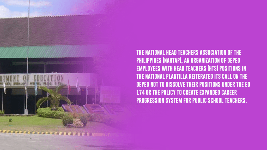 The National Head Teachers Association of the Philippines (NaHTAP), an organization of DepEd employees with Head Teachers (HTs) positions in the national plantilla reiterated its call on the DepEd not to dissolve their positions under the E0 174 or the policy to create expanded career progression system for public school teachers.