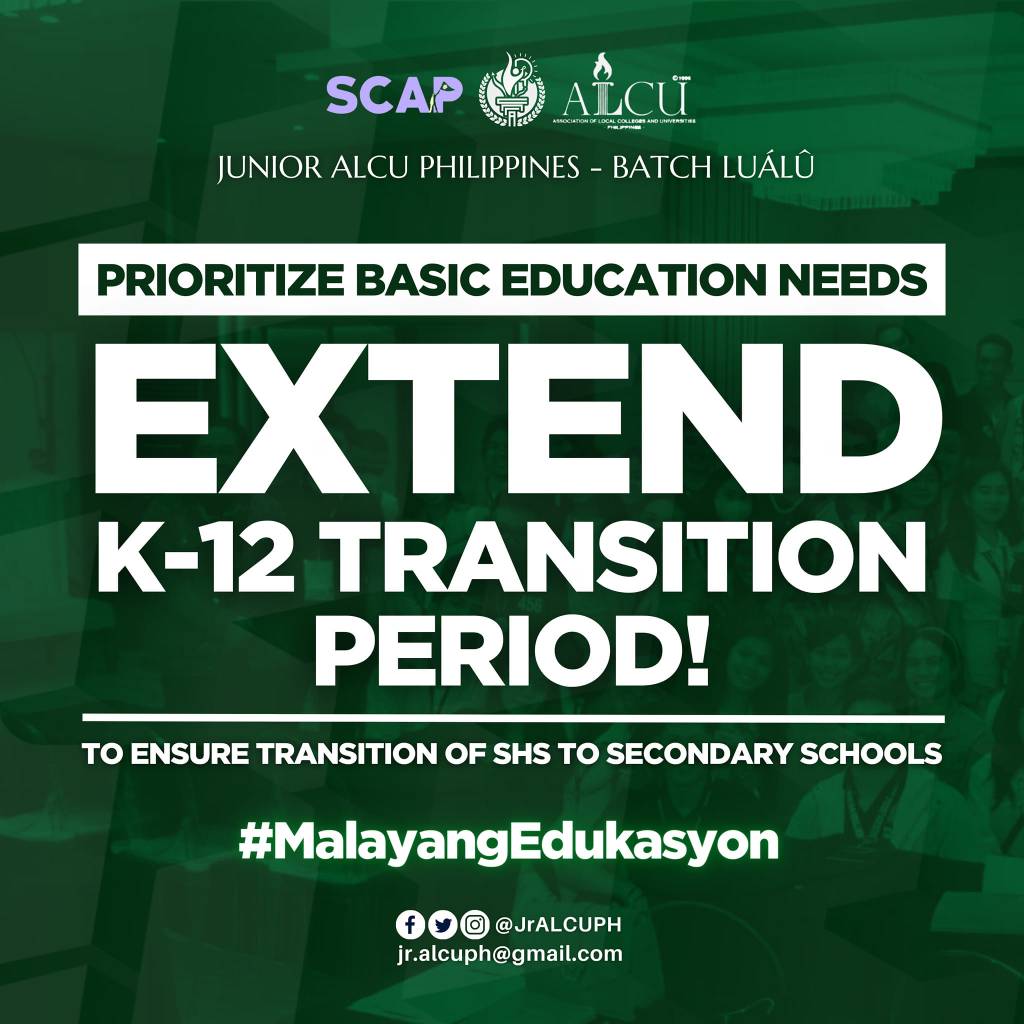 The Junior Association of Local Colleges and Universities (Jr. ALCU) and the Student Council Alliance of the Philippines (SCAP) calls upon the Department of Education (DepEd) 𝘁𝗼 𝗽𝗿𝗶𝗼𝗿𝗶𝘁𝗶𝘇𝗲 𝘁𝗵𝗲 𝗲𝘀𝘁𝗮𝗯𝗹𝗶𝘀𝗵𝗺𝗲𝗻𝘁 𝗼𝗳 𝘁𝗵𝗲 𝗹𝗮𝗰𝗸𝗶𝗻𝗴 𝗰𝗹𝗮𝘀𝘀𝗿𝗼𝗼𝗺𝘀 𝗶𝗻 𝘀𝗲𝗰𝗼𝗻𝗱𝗮𝗿𝘆 𝘀𝗰𝗵𝗼𝗼𝗹𝘀, 𝗮𝗻𝗱 𝗳𝗼𝗿 𝘁𝗵𝗲 𝗖𝗼𝗺𝗺𝗶𝘀𝘀𝗶𝗼𝗻 𝗼𝗻 𝗛𝗶𝗴𝗵𝗲𝗿 𝗘𝗱𝘂𝗰𝗮𝘁𝗶𝗼𝗻 (𝗖𝗛𝗘𝗗) 𝘁𝗼 𝗲𝘅𝘁𝗲𝗻𝗱 𝘁𝗵𝗲 𝗞-𝟭𝟮 𝘁𝗿𝗮𝗻𝘀𝗶𝘁𝗶𝗼𝗻 𝗽𝗲𝗿𝗶𝗼𝗱.