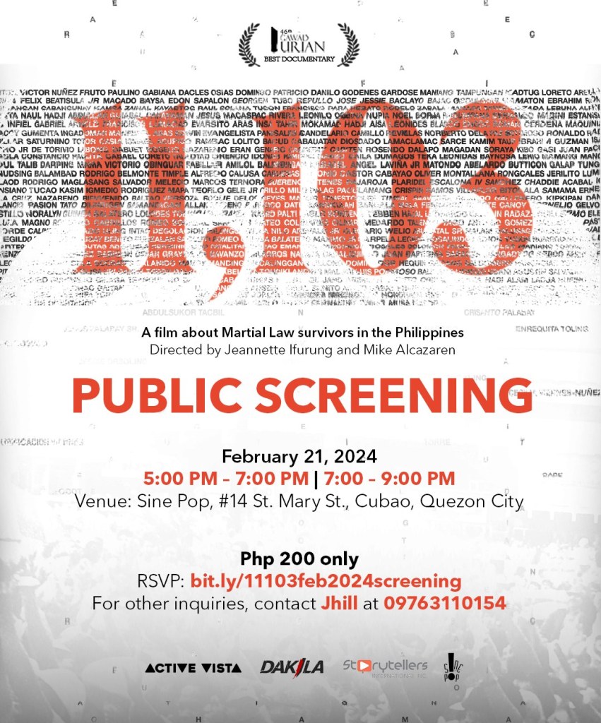 #HumanRights #MartialLaw. Join us in commemorating the 38th anniversary of the People Power Revolution by watching the 46th Gawad Urian Best Documentary Film 11,103 this February! Book your tickets now through this link: bit.ly/11103feb2024screening 11,103 is a powerful collection of survivors’ stories that sheds light on the state-sponsored violence during the Marcos dictatorship. Don’t miss…