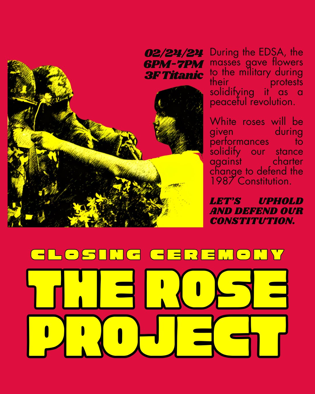 Together, we defend our Constitution from Charter Change, and defend the historical narrative of EDSA through the following activities: