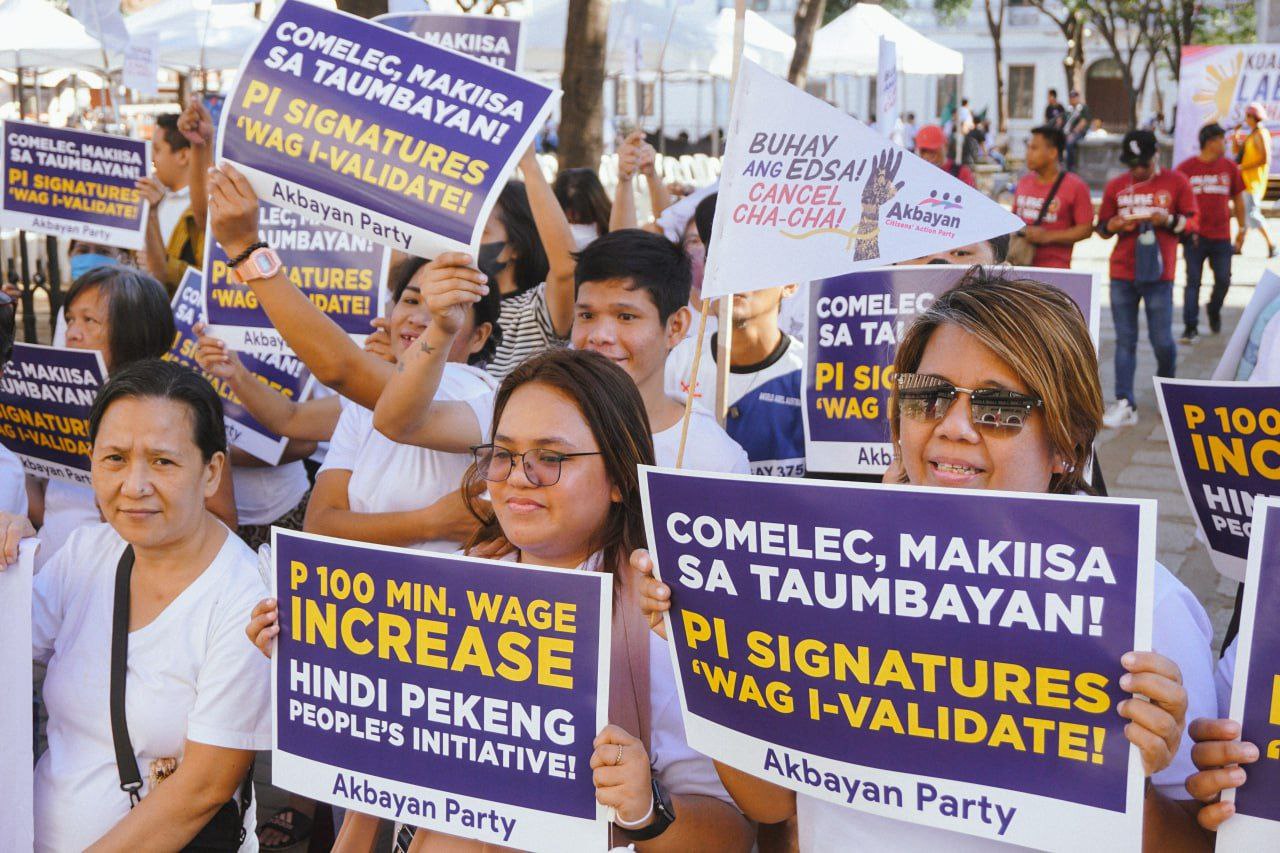 Akbayan Party, alongside several labor groups and social movements, staged a protest rally outside the Commission on Elections (Comelec) headquarters in Manila on Thursday, demanding the dismissal of signatures submitted for a purported “people’s initiative” (PI) to revise the 1987 constitution.