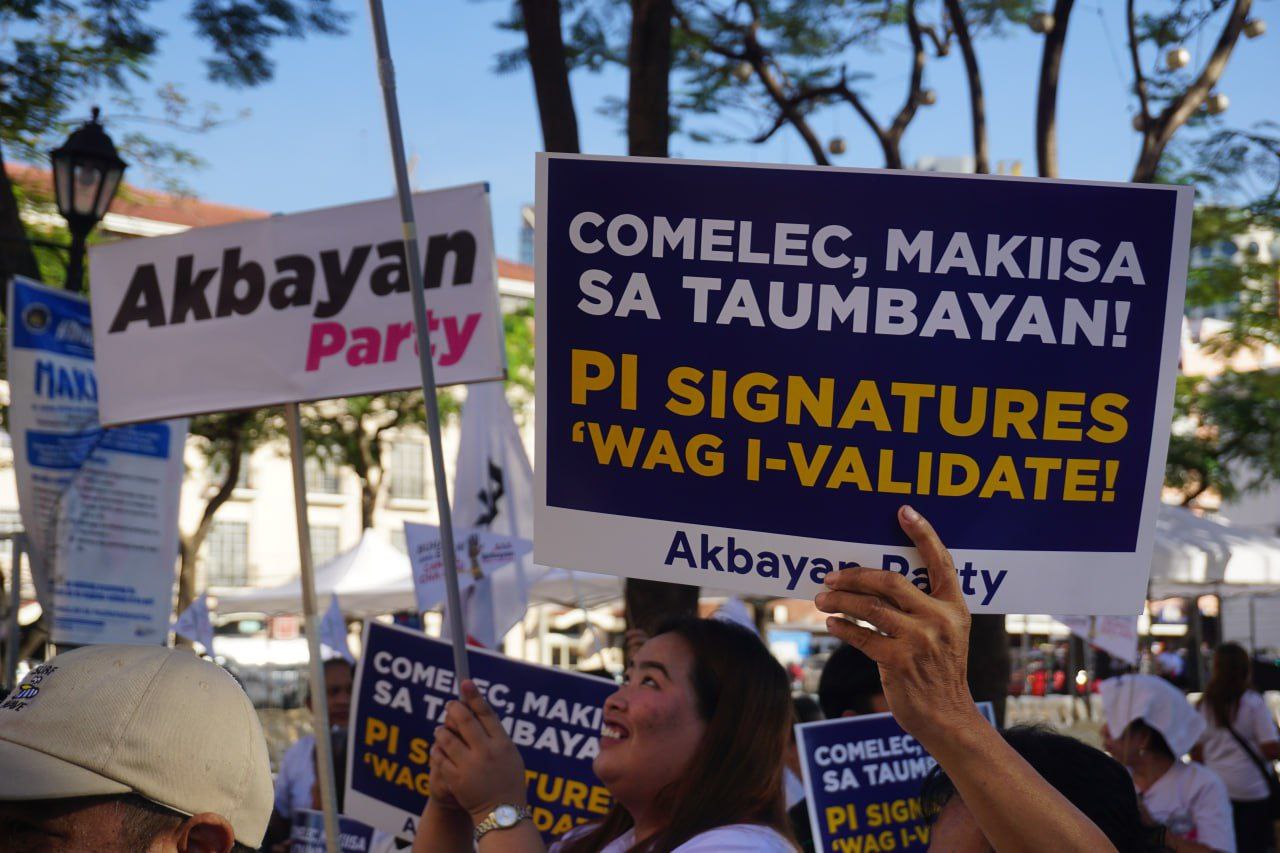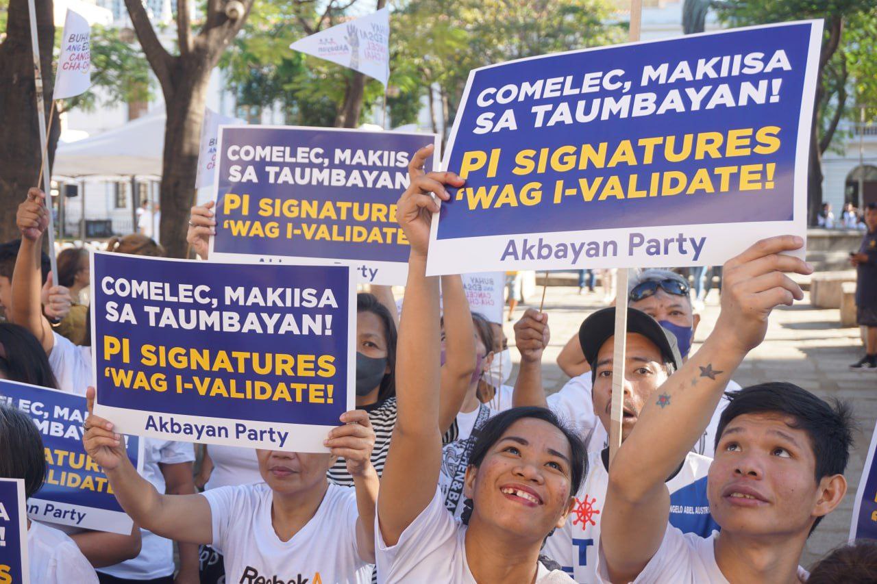 Brandishing placards emblazoned with the slogan “Comelec, Join the people! Do not validate PI signatures!”, Akbayan members underscored the critical role of constitutional bodies like the Comelec to thwart attempts aimed at subverting the current constitution to entrench politicians in power and undermine the nation’s electoral democracy.