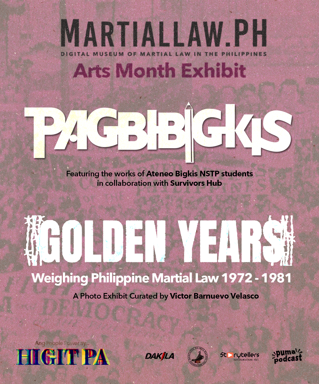 DAKILA, in collaboration with Ateneo Bigkis NSTP Students and the Survivors Hub, celebrates Filipino heroism democracy at the February Arts Month Exhibit. #PAGBIBIGKIS is a web exhibit that the audience can visit at https://martiallaw.ph/. In a separate exhibit titled Golden Years: Weighing Philippine Martial Law 1972-1981, Victor Barnuevo Velasco subjects the narrative of “Golden Years” to scrutiny through a curation of photos that shows the opposite. Both of which serve as a visual reminder: To remember is to fight!