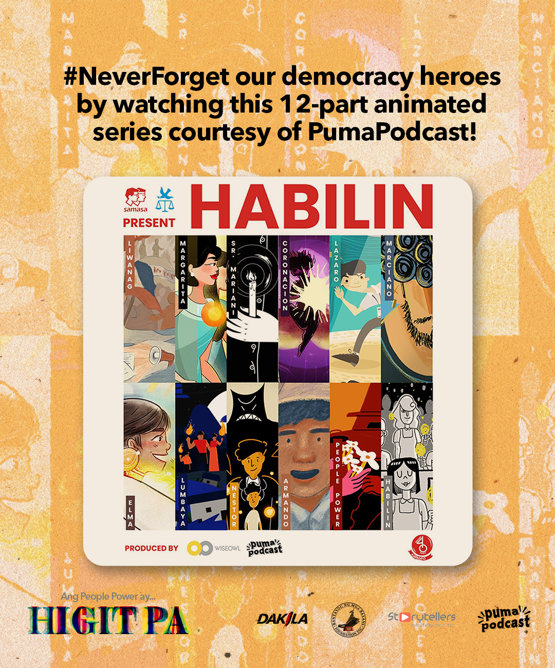 For young Filipinos, the years of Martial Law may seem like an unreachable past, obscured by the false nostalgia of the “Golden Years” of Philippine politics and economy. PumaPodcast, through a kid-friendly way of passing on the extraordinary stories of Martial Law, combats this narrative through “Habilin,” a 12-part podcast and animated series showcasing the lives of ordinary Filipinos who joined the struggle for their rights and democracy.