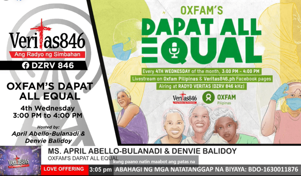 Hosted by Ms April Abello-Bulanadi at Ms Denvie Balidoy Mapapakinggan at mapapanood sa Radyo Veritas DZRV 846, Sky Cable Channel 211, at FB livestream ng Oxfam Pilipinas at DZRV 846