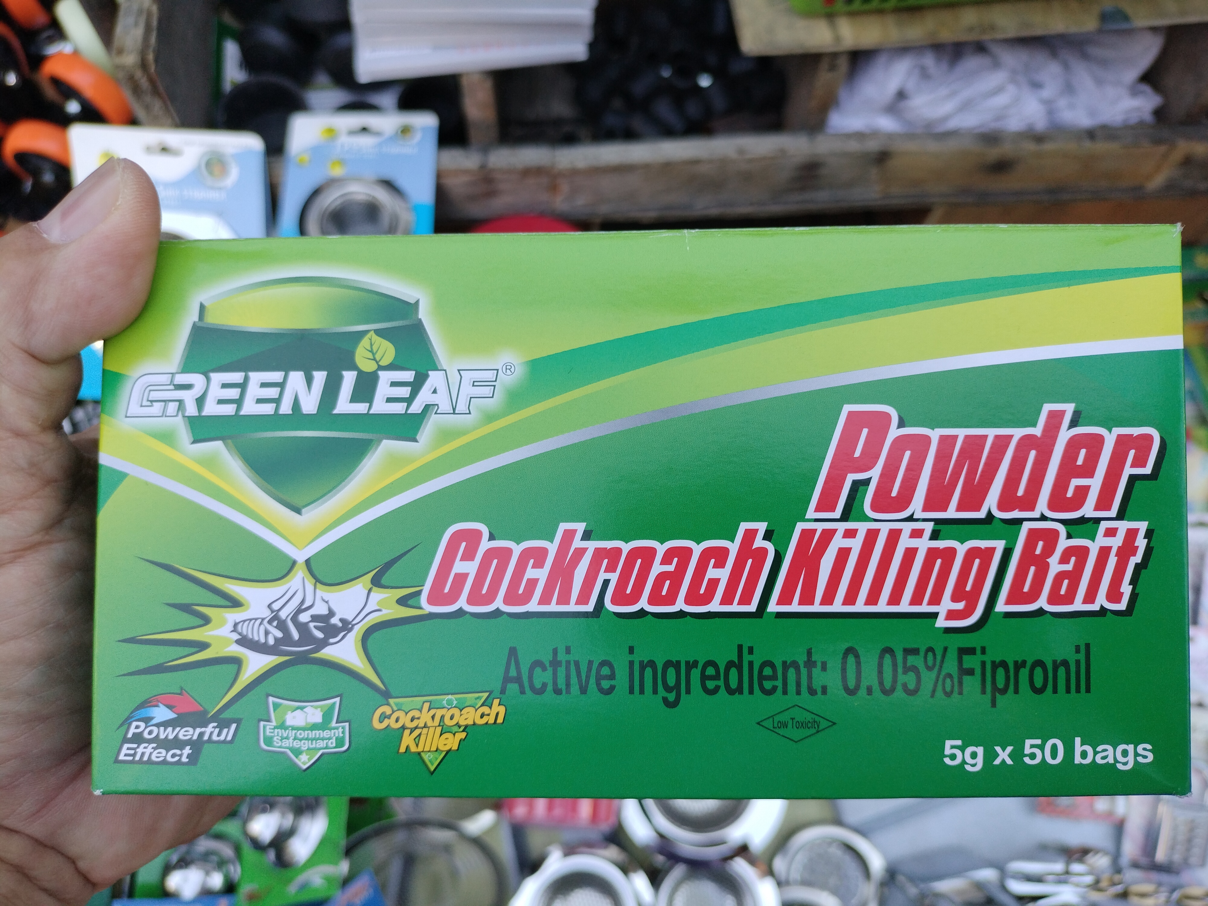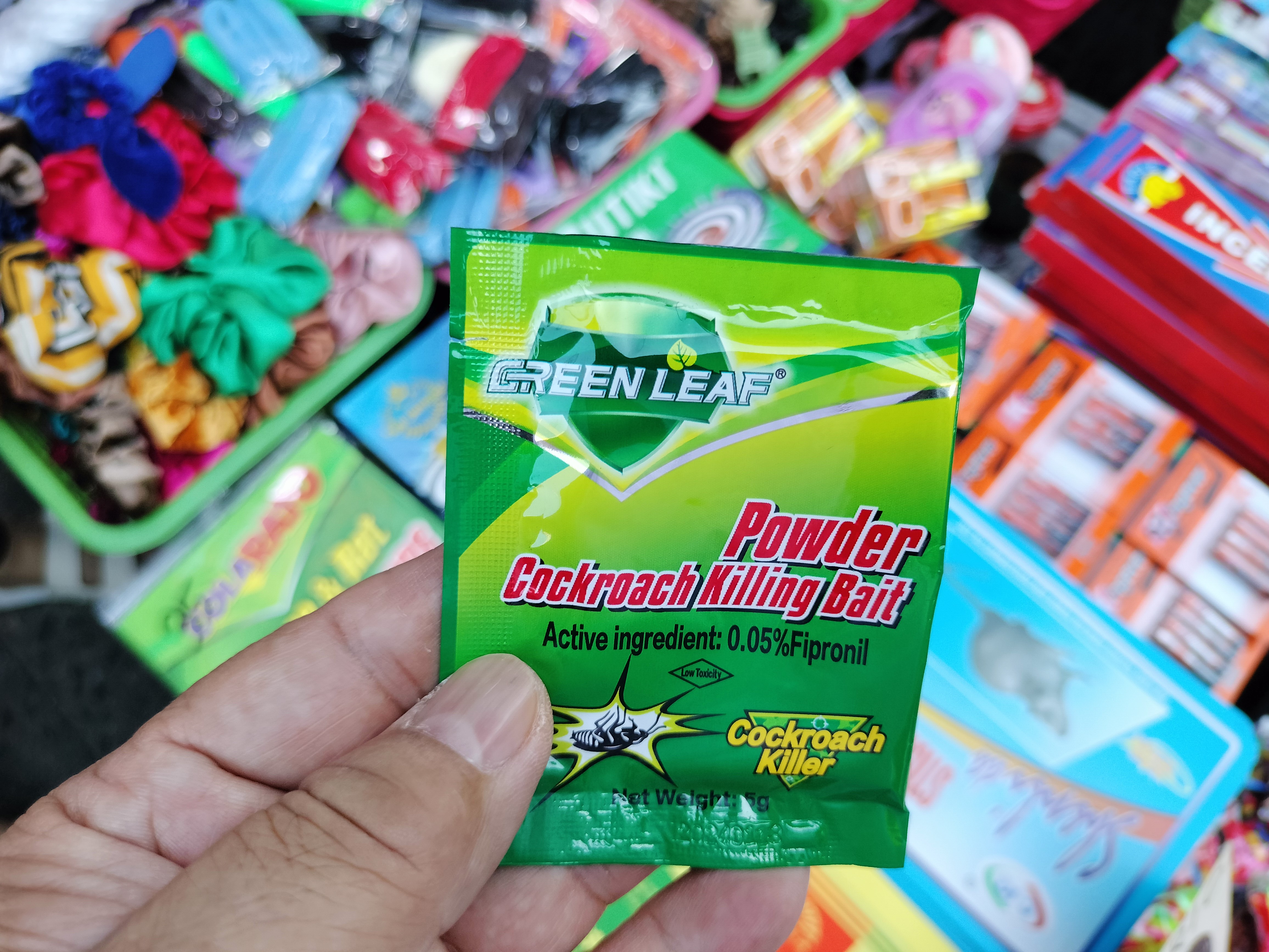 In Quiapo, Manila, for instance, Green Leaf Powder Cockroach Killing Bait is sold for P10 per sachet of five grams by some sidewalk vendors in Carriedo, Evangelista, Carlos Palanca and Villalobos Streets. Online sellers sell the product for P145 to P295 for a box of 50 sachets.