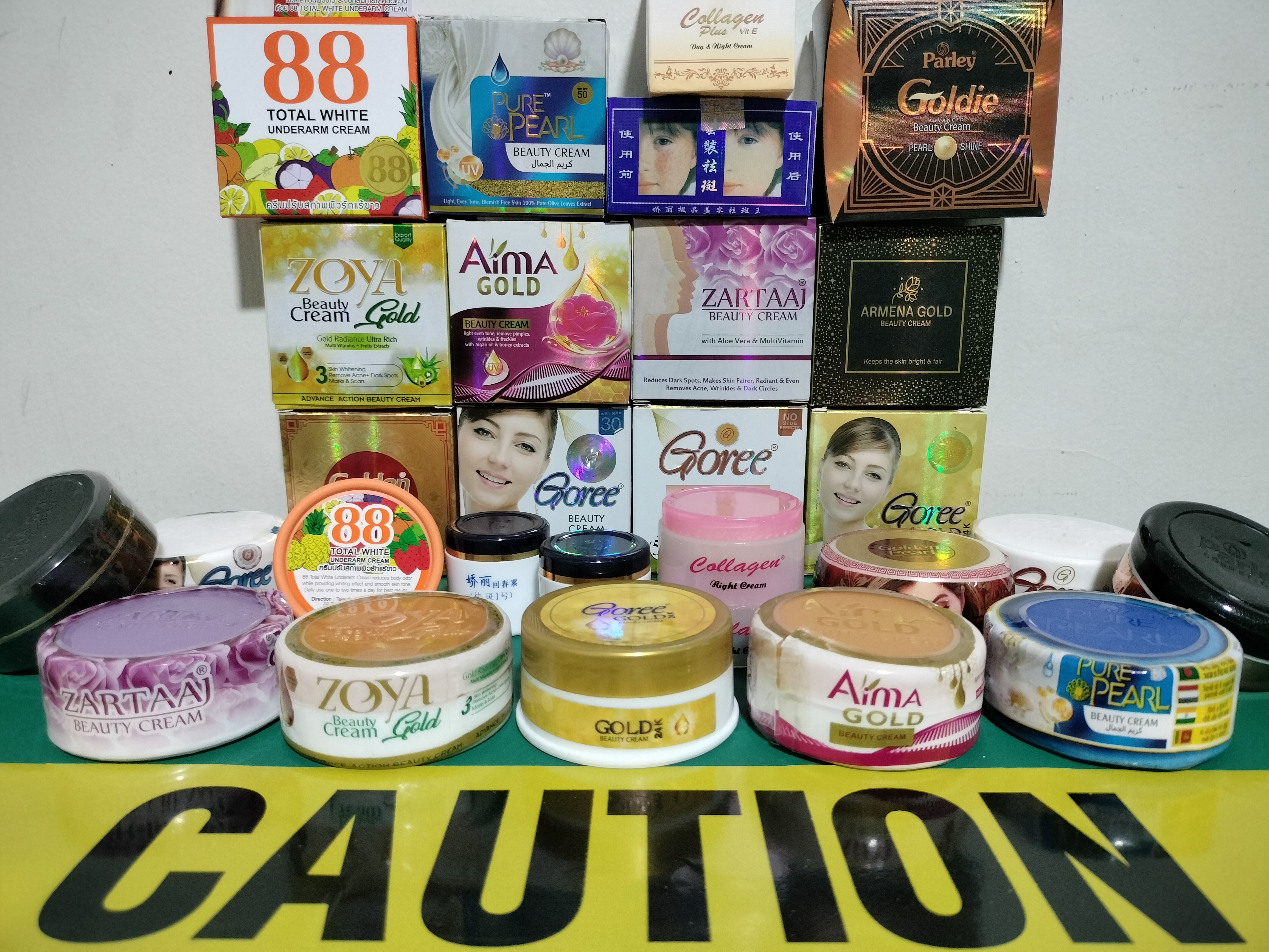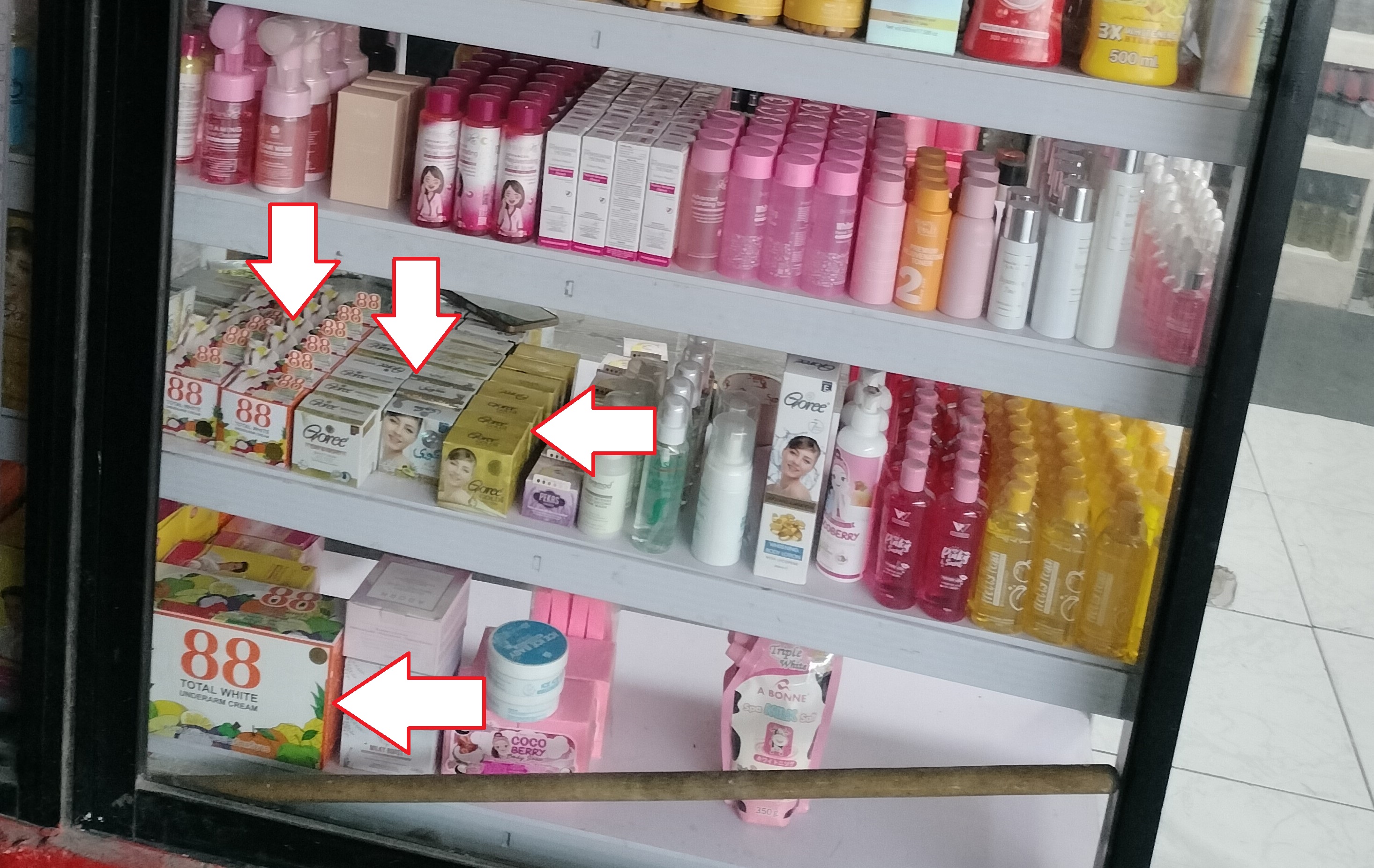 Openly sold in these stores are eight cosmetics banned by the FDA from 2010 up to 2023 for containing mercury and/or for lacking market authorization, including 88 Total White Underarm Cream, Collagen Plus Vit E Day & Night Cream, Golden Pearl Beauty Cream, Goree Beauty Cream with Lycopene, Goree Day & Night Beauty Cream, Goree Gold 24K Beauty Cream, Jiaoli Miraculous Cream, and Parley Goldie Advance Beauty Cream.