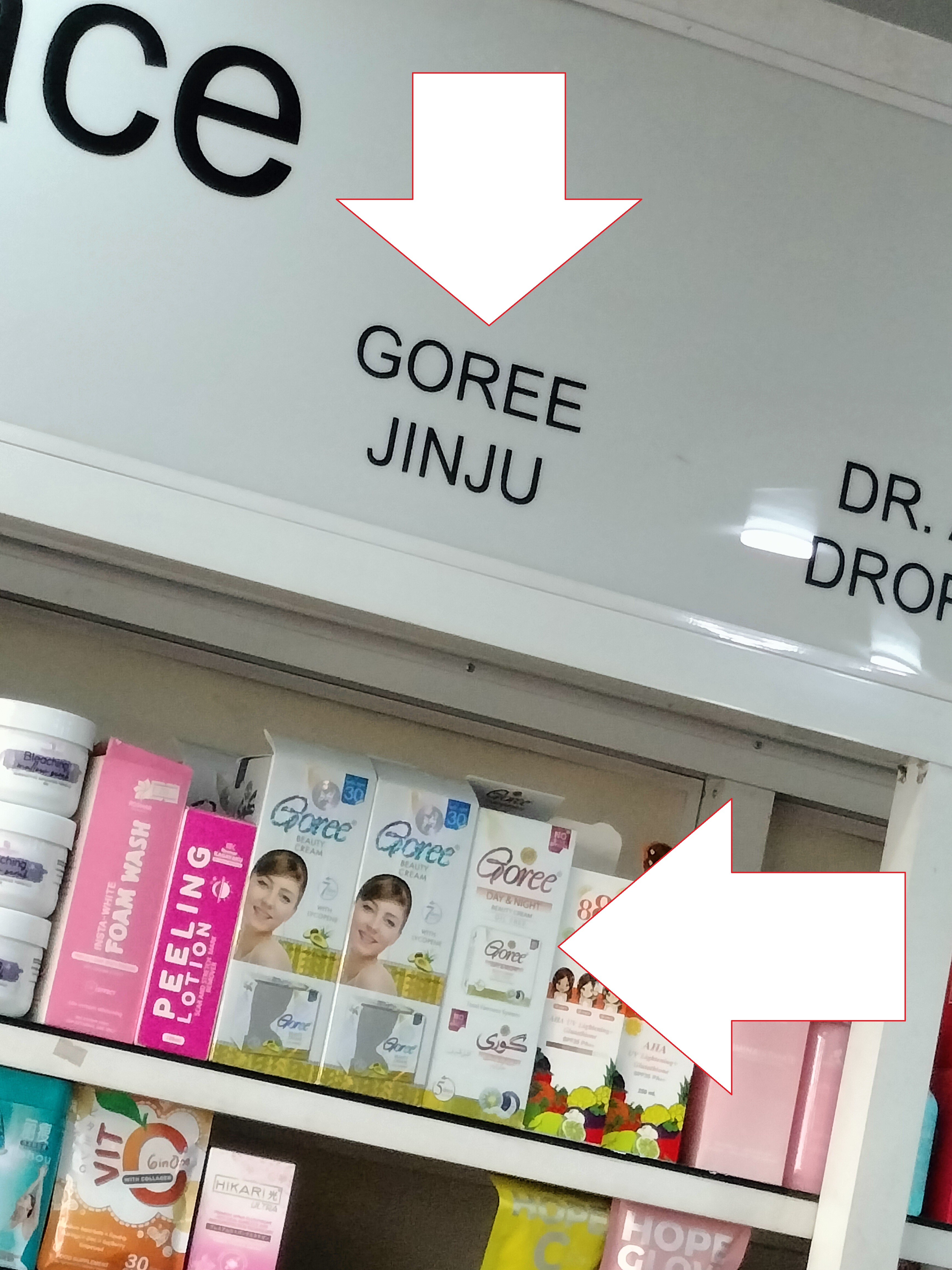 Openly displayed and offered for sale to consumers aspiring for a lighter skin tone are three variants of Pakistan-made Goree Beauty Cream and Thailand-made 88 Total White Underarm Cream.