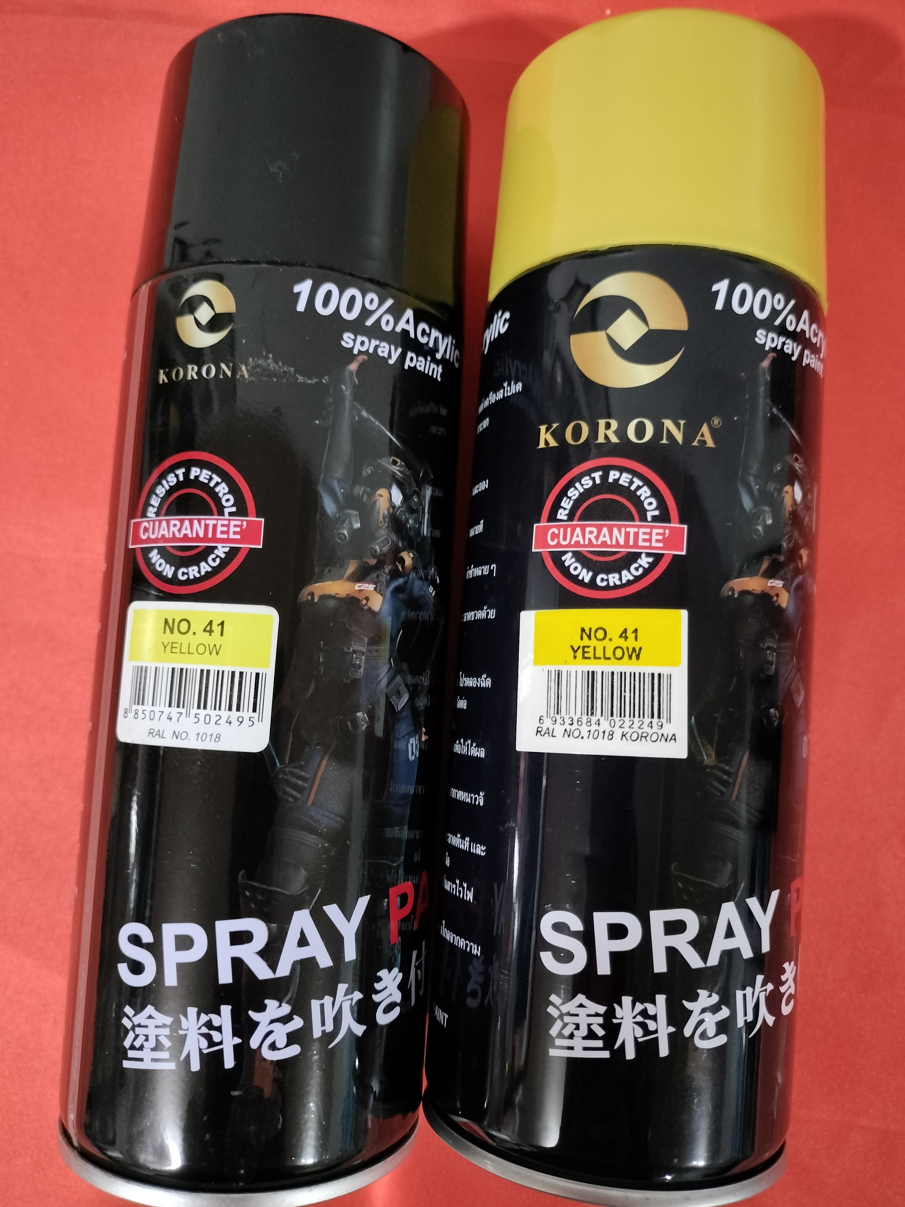 Korona Spray Paint used to be “made in Thailand” with a smaller product logo in front and an all-black cap or lids regardless of the paint color. The old Thai-made products were manufactured in 2021.