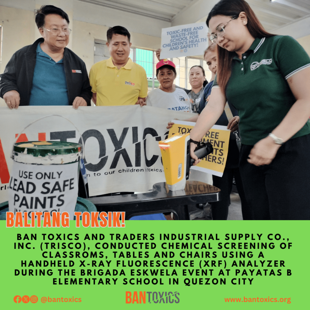 During the program, BAN Toxics and Traders Industrial Supply Co., Inc. (TRISCO), a private industrial trading firm, conducted chemical testing of school facilities, paint, and cleaning products using a handheld X-ray Fluorescence (XRF) analyzer.