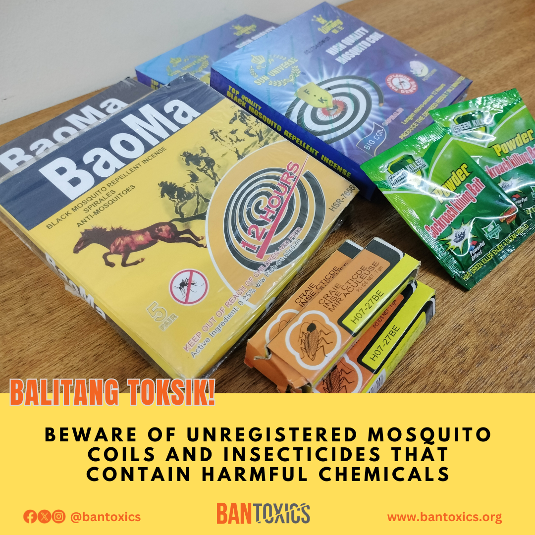 BAN Toxics encouraged the public to verify if a pesticide product is registered with the FDA. “Switch to organic mosquito coils and bioinsecticides to reduce exposure to toxic synthetic chemicals. Consider using plant-derived alternative products such as neem, citronella, papaya leaves, garlic, and lemongrass as well as other natural insecticides,” Dizon advised.
