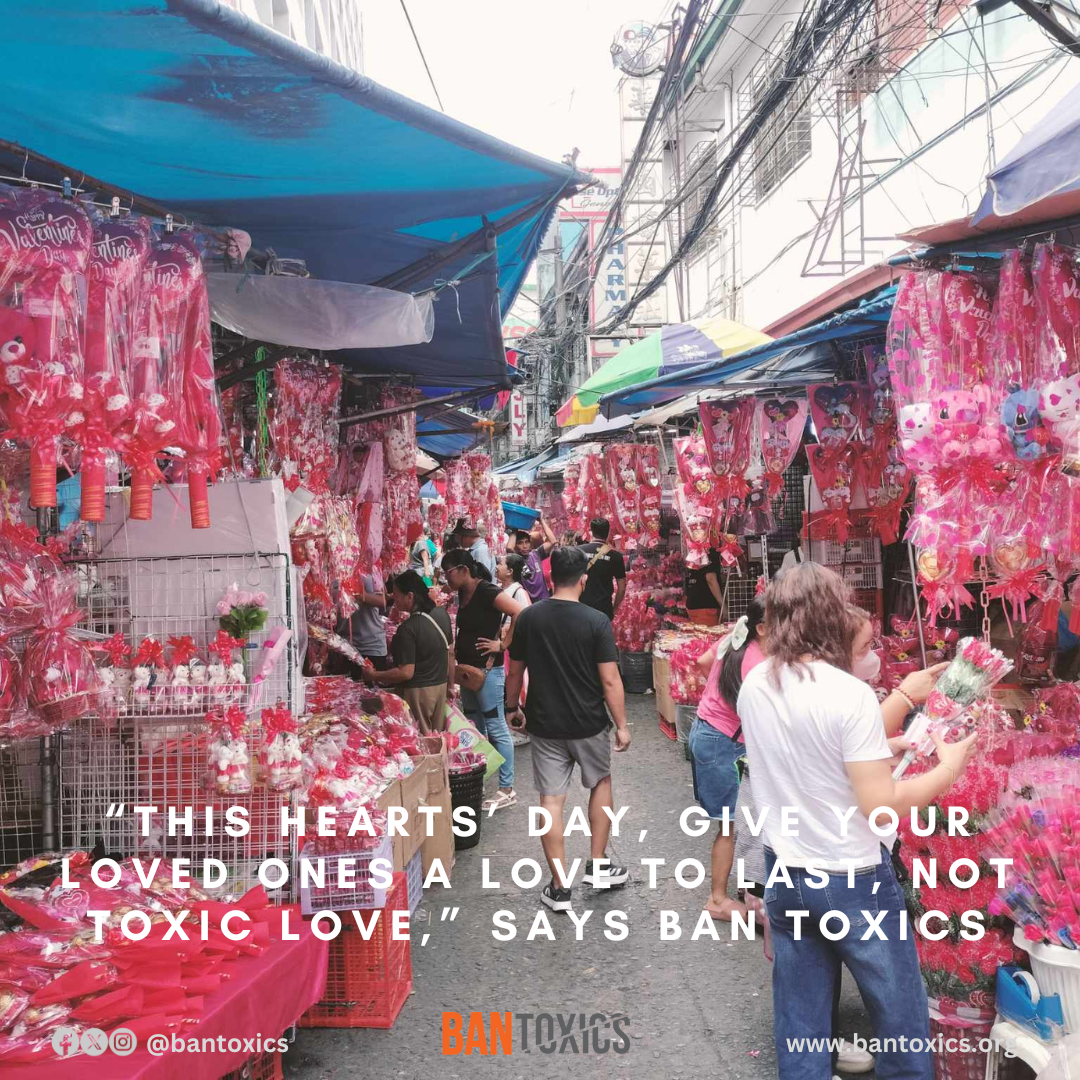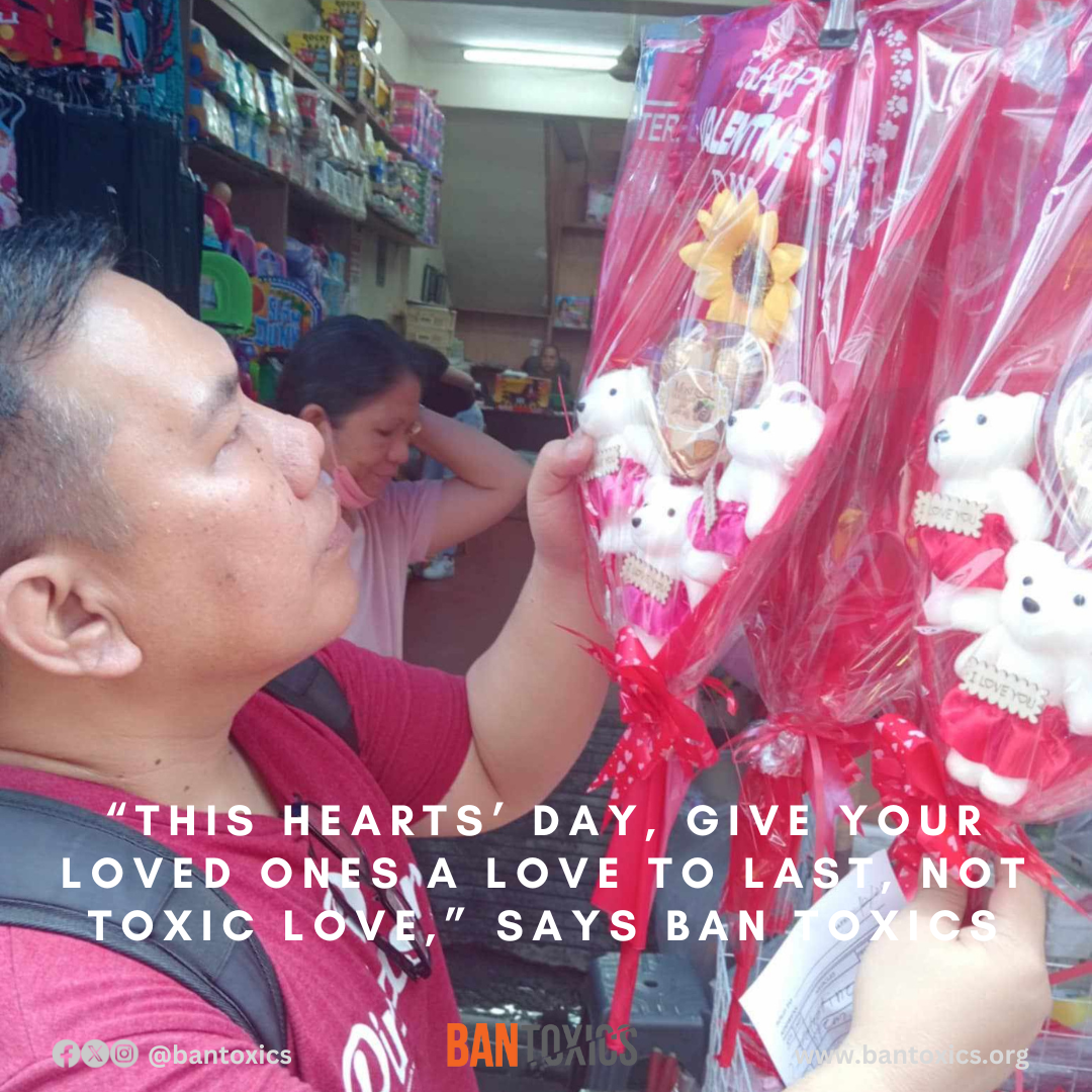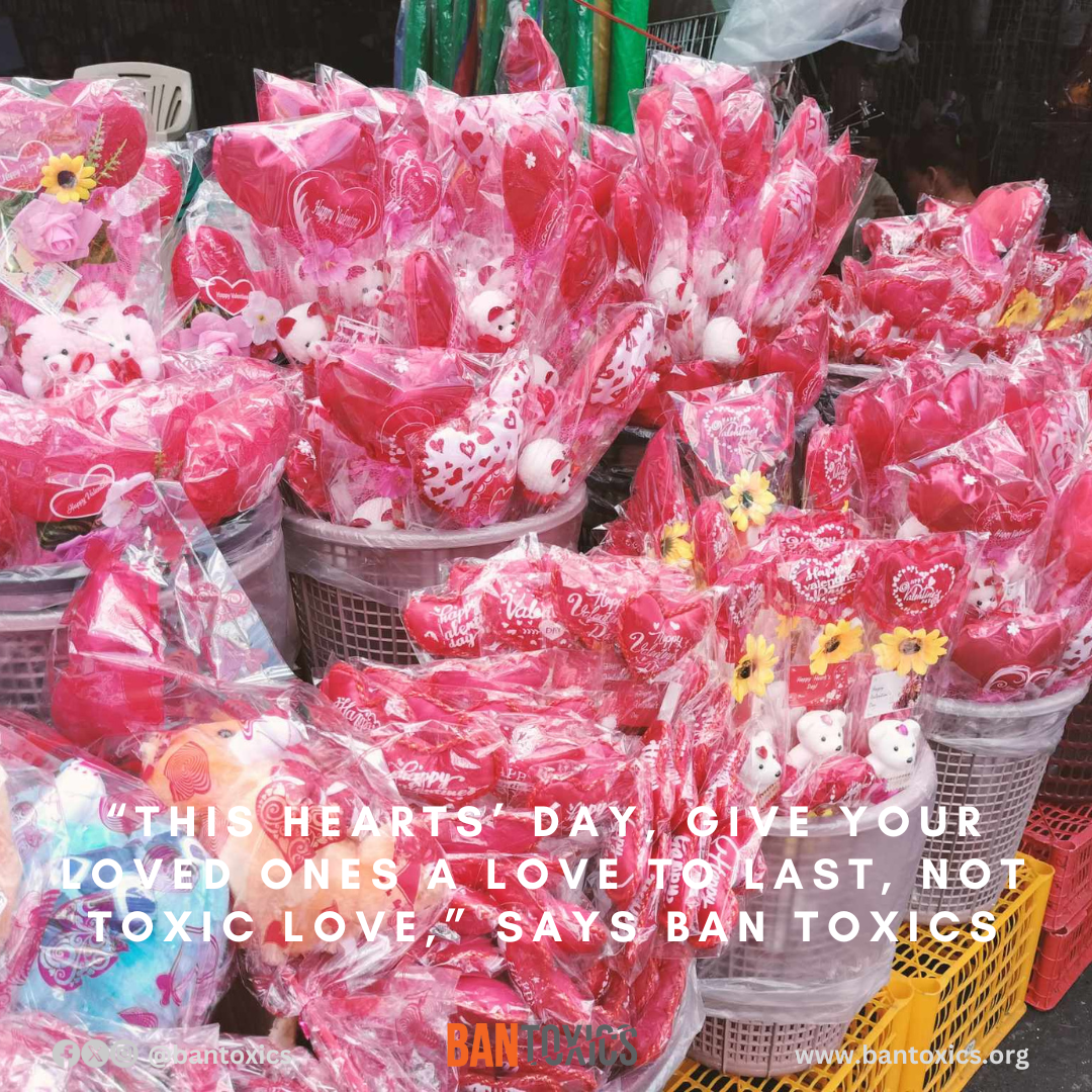 A recent market monitoring by the toxic watchdog group BAN Toxics found various Valentine’s Day gifts being sold in the streets of Makati, Manila, Pasay, and Quezon City. Among these were stuffed hearts, teddy bears, mugs, plastic roses, heart-shaped chocolates, and other novelty items—some of which may contain harmful substances.