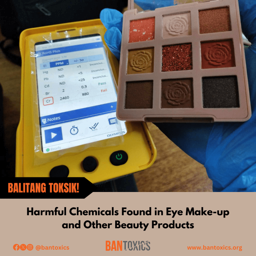 As part of its safe cosmetics campaign, the group purchased seven eye shadow products from the “Presyong Divisoria” store in Taguig City and beauty shops in Caloocan City, priced between P60 and P150. The samples were screened using a Vanta C Series XRF chemical analyzer and were found to contain antimony, arsenic, chromium, cadmium, lead, and mercury. Two samples also listed propylparaben and methylparaben on their labels.